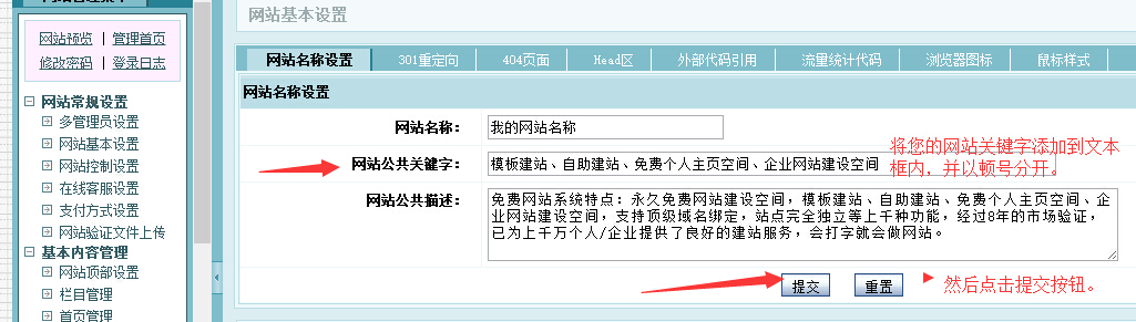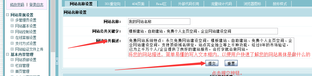首先要進(jìn)入您的網(wǎng)站后臺(tái),點(diǎn)擊網(wǎng)站基本設(shè)置》網(wǎng)站基本名稱》網(wǎng)站公共描述
