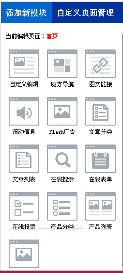 單擊需要添加的模塊類型,會(huì)彈出編輯頁面 如圖 產(chǎn)品分類(您在電腦上編輯好的分類 您在手機(jī)網(wǎng)站上調(diào)用就可以了)